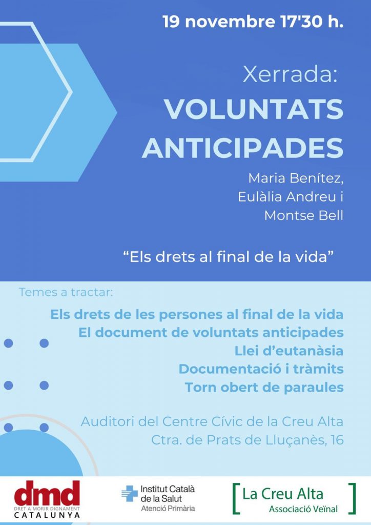 Xerrada informativa sobre els drets al final de la vida i les voluntats anticipades el proper 19 de novembres de 2024 a l’Auditori del Centre Cívic de la Creu Alta.